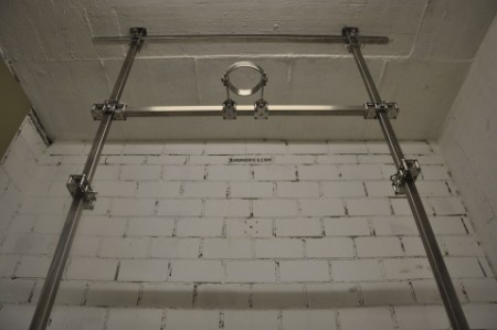 Der Explicit Numerics Baukasten. Auf Grundlage von Vierkantrohr das durch Befestigungsanker an beliebigen Orten angebracht werden kann. Gleitwagen - an denen Dinge angebracht werden können, oder die ein weiter Ausbauen in andere Richtungen ermöglichen - fahren auf den Rohren. Sie können aber auch an jeder Stelle fixiert werden.